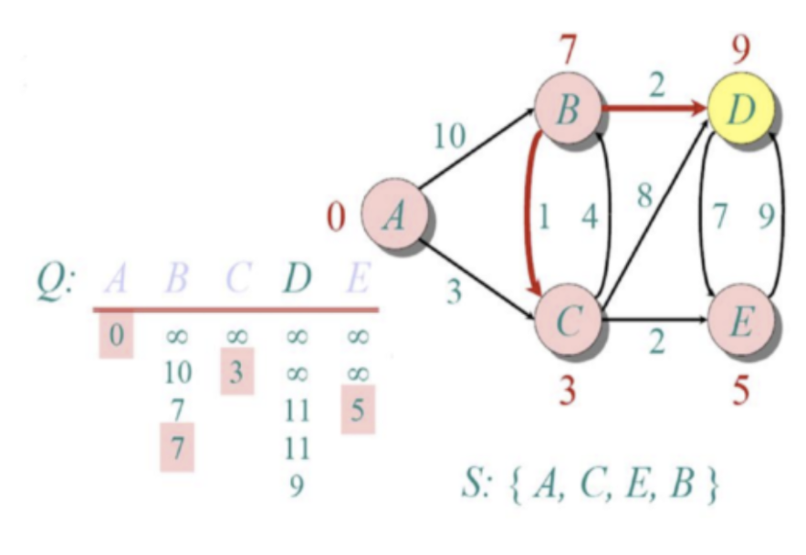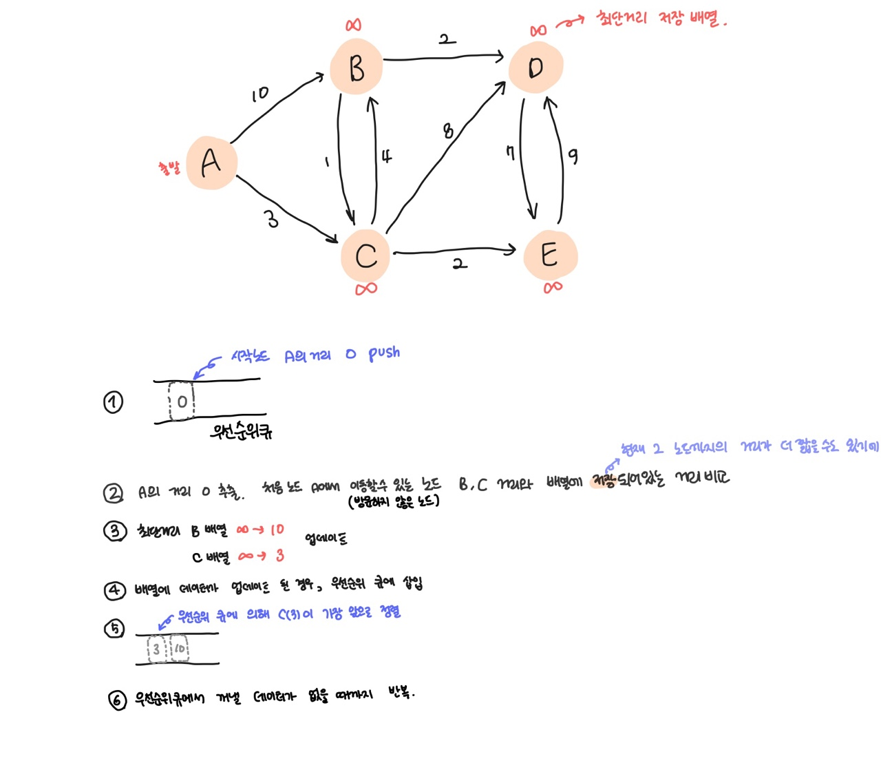7. min (방금 선택한 노드의 최단거리 테이블 값 + 앞으로 갈 노드 x까지의 값, 현재 최단거리 테이블의 x 값) 으로 최단거리 테이블 갱신