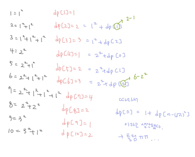 dp[10] 일 때, 10의 가장 가까운 제곱 수인 3^2 하나와 10-9 = 1인 dp[1]의 값을 더하면 될 것이라고 생각했다.