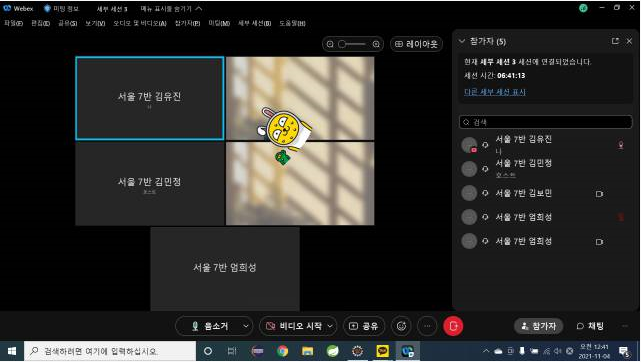 그리고 관통프로젝트 할때는 교수님께서 웹엑스를 계속 틀어주셨는데 아래 캡쳐처럼 우리 스터디원들이 제일 늦게까지 남아서 열심히 했다.
